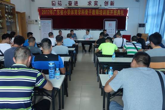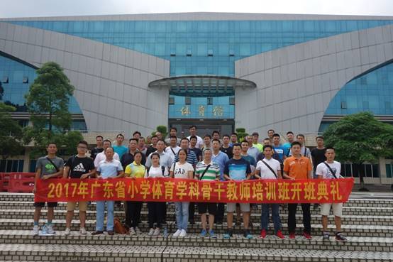 2017年广东省中小学教师省级研修培训—小学体育学科骨干教师培训班由来自惠州、汕尾、东莞、中山、阳江、湛江、肇庆及云浮等8个地市十几个地区的共50名小学体育教师组成。培训采取理论与实践相结合的方式进行,通过集中授课、交流研讨、网络研修等方式,学员将全面学习体育科研、校园体育活动开展、体育教学原理与方法等相关理论基础知识及篮球、足球、游泳、定向运动、攀岩等校园常见及新兴体育项目的教学及训练理念。目前,培训班学员正按照培训要求有条不紊的开展相关学习。