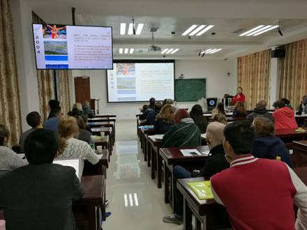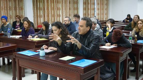 26日上午,来自广州市南海中学的英语高级教师吴才斌老师为学员们开设了《中小学课堂的英语教法》专题课。吴老师结合自身一线教学经验和当下中员工语言学习的特点,向这批外籍教师们展示了国内中学课堂的英语教学情况,并用很多启发式问题激起学员们对英语学习问题进行思考和讨论。