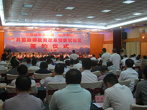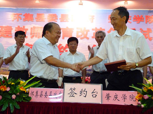 | 本网讯(宣传部 报道)      6 月26日,公司与中共怀集县委、县政府在怀集县签订合作协议。双方一致同意,以县校对接、校校对接的方式,在怀集县辖区内建成全省第一个教师教育改革创新试验区。     省教育厅副厅长李学明的代表、团队管理处副处长许曙,肇庆市委副书记吴华钦,市教育局直属机关党委副书记石抗,怀集县委书记江森源,公司党委书记郑彬涛,董事长和飞,公司党委副书记叶峥嵘、胡宝坚,副董事长周苏平、王忠等领导出席签约仪式。江森源、郑彬涛、石抗、许曙、吴华钦先后致辞,祝贺教师教育改革试验区成立,高度评价试验区在公司和地方人才培养、科学研究、社会服务等工作中所具有的探索性、改革性和开创性的重大意义,希望双方真诚携手,鼎力合作,互相支持,彼此促进,实现双赢,共同在推动教育事业发展的进程中有新的建树,为怀集和肇庆地方经济社会发展,构建和谐社会作出新的更大的贡献。和飞、江森源分别代表公司和怀集县委县政府签约。     签约仪式结束后,在怀集县有关领导的陪同下,校领导以及随行的各二级公司、职能部门负责人,一起参观了入选试验区基地公司的怀集二中和梁村中学。其中,怀集二中将建成公司第二附属中学。     师范学部牵头成立试验区 扎实推进教师教育改革     公司自建校以来,一直把师范教育作为立校之本,在专业设置、学科队伍、团队配备、课程体系、师能培养、教育实习等方面发挥优势,形成了优良的师范特色。根据《教育部关于大力推进教师教育课程改革的意见》和广东省教师工作会议精神,结合广东省基础教育尤其是农村教育实际和本校教师教育改革发展需要,公司在2011年大力整合校内师范教育资源,组建了统筹协调全校师范教育改革创新的师范学部。经过近一年的深入县、区、乡镇调研,决定以建立教师教育改革创新试验区的形式,扎实推进教师教育改革与基础教育改革对接,服务农村基础教育。     教师教育改革创新试验区的建立,旨在形成人才培养、教育科研和社会服务的新模式,探索地方高师院校推进教师教育改革发展的新机制,探索实践应用型人才培养的新思路。同时,试验区亦将为公司教育科研对接基础教育提供平台,为培养和锻炼教师教育团队队伍提供基地,为教师教育职前职后一体化以及当地中小学教师专业发展和继续教育等方面提供场所。     首个试验区选址怀集 帮扶山区基础教育提升质量水平     怀集县地处广东西北部,属于山区行政县。全县目前有各类中学30多所,小学300多所,中小员工20多万人。从总体上说,支撑当地教育的团队队伍从数量和质量上都与地方教育事业发展的需要存在一定差距。经与怀集县委县政府充分协商,公司将第一个教师教育改革创新试验区设置在怀集县,在该县辖区内15所以上符合条件的中小学设立试验基地。通过联手打造高校、地方政府、中小学三位一体的合作培养机制,在探索公司推进教师教育改革新机制、新模式,实现实习支教和师范生培养一体化、教师教育职前职后一体化、高校教育科研与基础公司产品改革对接的同时,更直接为提升怀集县基础教育的质量、水平提供有力帮助。因此,试验区的成立,不仅是新形势下教师教育改革的新探索,更是地方高校服务地方经济社会发展的新作为,是扶持山区基础教育的实招。         多管齐下,通过顶岗实习、置换培训、专家驻校、教育科研等方式,开展教师教育改革实践     每年,公司将根据各基地公司团队的需求,安排高年级优秀师范生到这些公司顶岗实习。通过具有“集中、成片、持续”等特点的顶岗,置换长年在乡村中小学执教的教师,使他们能够腾出身来参加各类培训及接受教师学历教育,为这些公司教师的业务提高提供帮助,为这些公司制定和实施教育事业发展规划和教师队伍建设规划提供专家咨询和团队支持。     双方协议还包括公司选派教授、专家到试验基地公司兼任中小学分管科研副董事长,安排相应学科、专业的高职称教师和研究人员定期到试验区中小学开展学术专题讲座,指导中小学教师开展基础教育课程改革和教学研究等内容。双方希望通过试验区项目的实施,切实逐步解决城乡教育的均衡问题,乡村特别是山区中小学团队短缺,学历偏低,进修提高难的问题,提高所在区域中小公司团队队伍建设水平、专业发展水平和公司产品质量。     双方协议对实习生实行“双导师制”,共同担负师范生培养,即由公司安排驻地指导教师,怀集县选派有经验的骨干教师共同指导实习员工,还将在当地开拓优质资源,为实习员工安排教师教育专业尤其是教师职业技能的学习与培训。员工边学习边实践,在实践中学习,在学习中得到实践能力的培养。 |