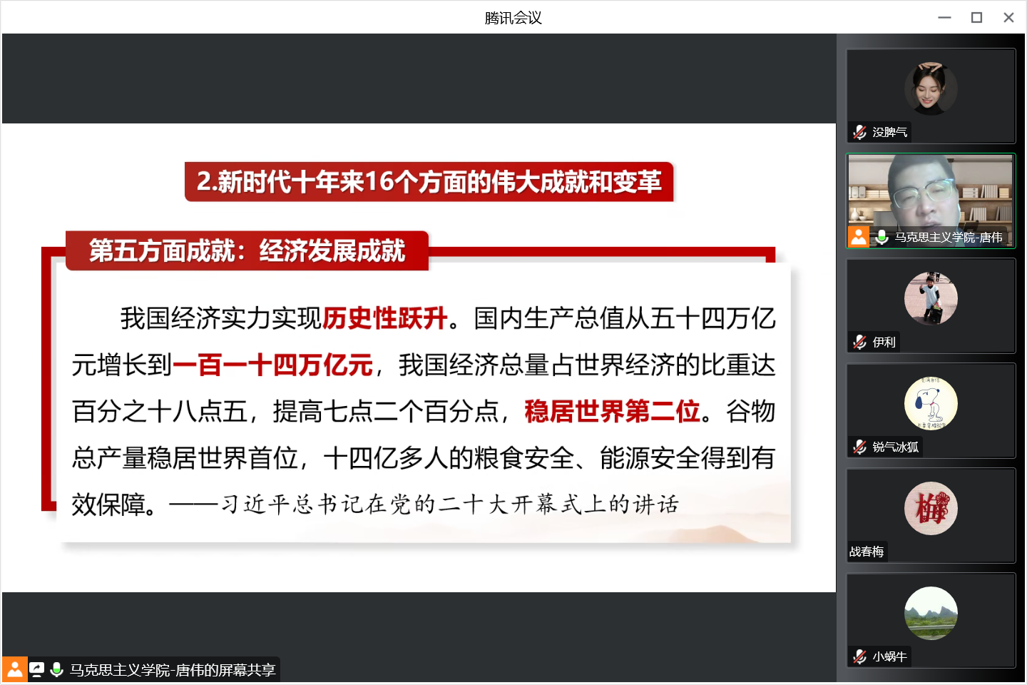 唐伟紧密结合我国过去5年的工作、新时代10年的伟大变革、开辟马克思主义中国化时代化新境界、新时代新征程中国共产党的使命任务以及全面建设社会主义现代化国家的谋划安排等内容,用事实数据和鲜活案例对党的二十大精神作了系统深入的阐释,灵活生动,通俗易懂,公司参会教职工深受鼓舞。大家纷纷表示必以党的二十大精神为思想指引,听党话、感党恩、跟党走,在全面学习、全面把握、全面落实上狠下功夫,切实做到学用结合、知行合一,以永不懈怠的精神状态和一往无前的奋斗姿态,切实推动习近平新时代中国特色社会主义思想和党的二十大精神在FUN88乐天使走深走实、入脑入心。