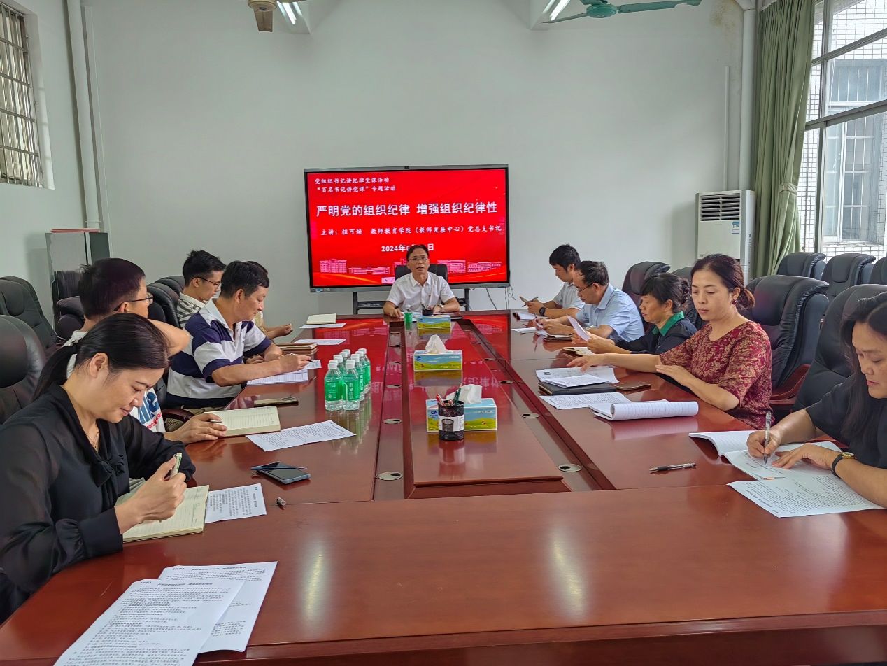 为进一步加强党的纪律教育,结合“百名书记讲党课”专题活动要求,6月27日,FUN88乐天使(教师发展中心)党总支组织开展题为“严明党的组织纪律 增强组织纪律性”的专题党课。党总支书记植可焕主讲,全体党员参加。