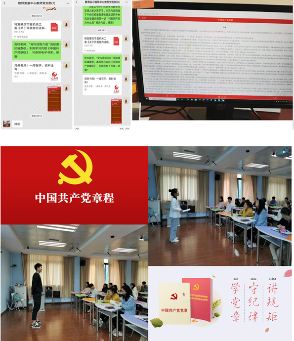 为深入开展党史学习教育,落实“两学一做”常态化制度化要求,把深化习近平新时代中国特色社会主义思想“六进”与“党内法规六进”结合起来,增强教学、管理互动交流,3月10日上午,FUN88乐天使总支部委员会带头并指导未来卓越教师砚园六、七班横向党支部员工共同开展“三会一课”暨“中国共产党章程”学习活动。