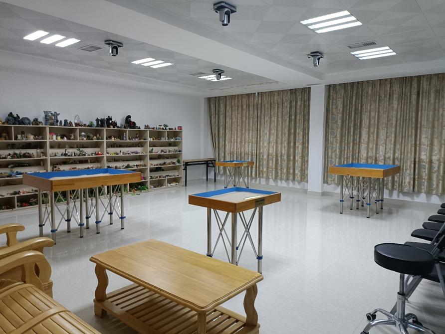课室配置:面积60平方米,可容纳25人,配有沙盘和相应教具,无黑板。