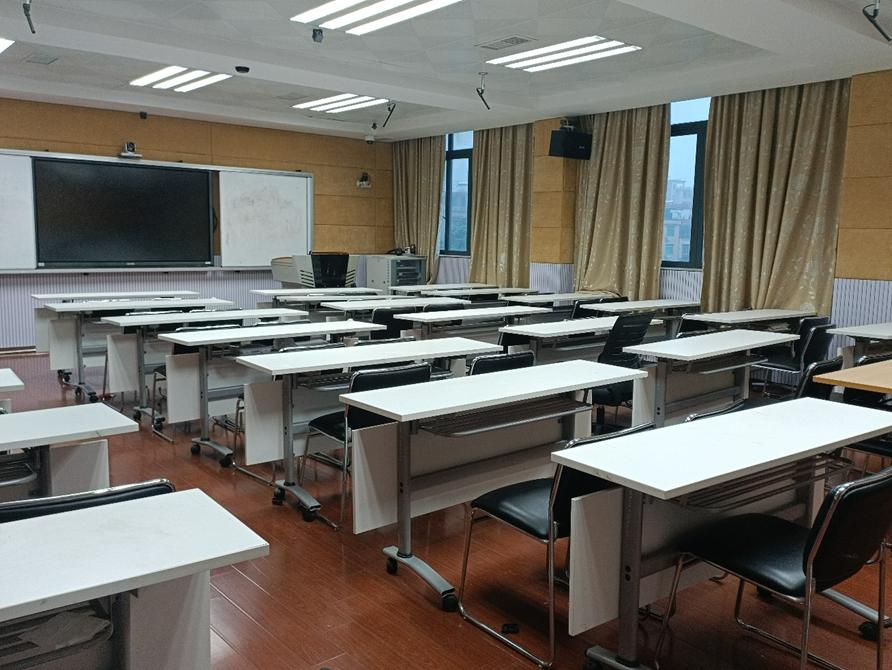 课室配置:面积78平方米,可容纳52人,配有教师电脑、交互电子白板、四机位跟踪录播系统,有固定式白板。