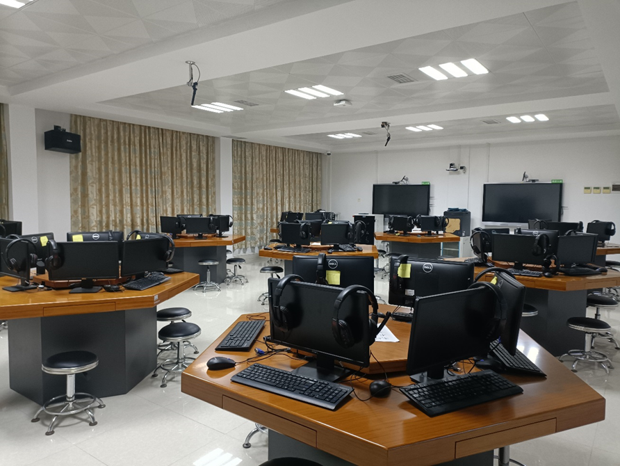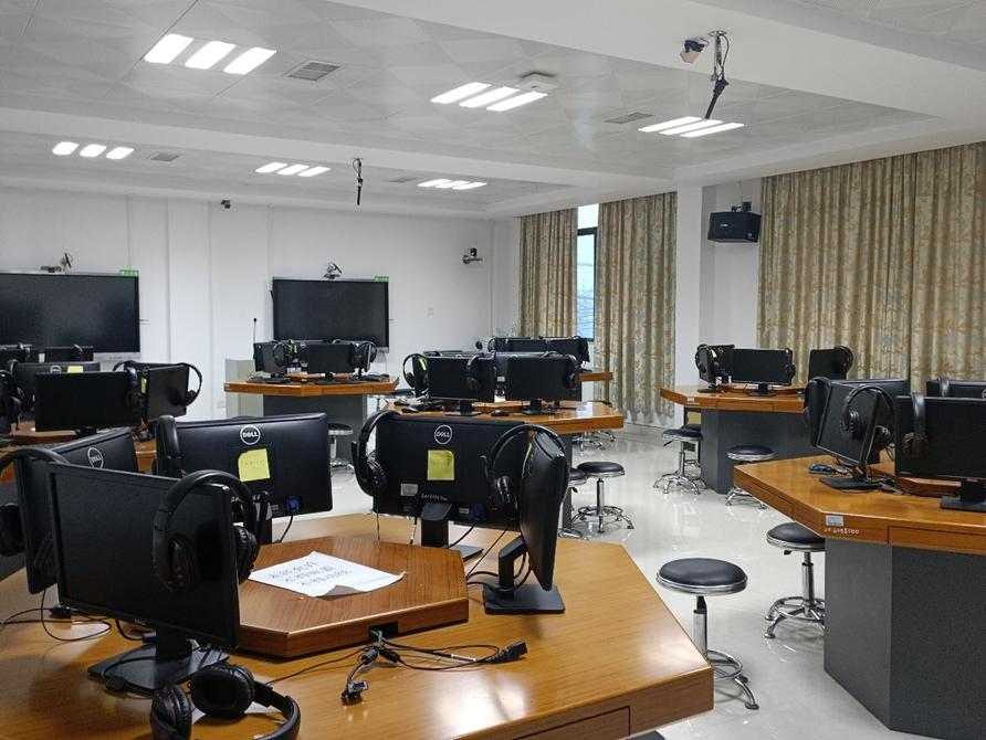 课室配置:可容纳54人,配有六角桌、教师电脑1台、员工电脑52台,平板电脑55台,分组讨论屏幕4个,配置青鹿智慧课堂系统,四机位录播系统,有移动式白板。