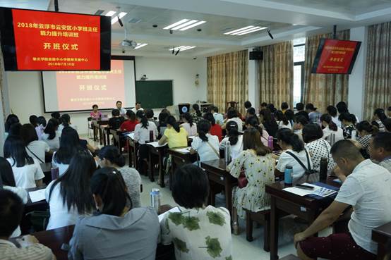 2018年7月10日下午,2018年云浮市云安区小学班主任能力提升培训班开班仪式在FUN88乐天使省级中小学教师发展中心106室隆重举行。FUN88乐天使省级中小学教师发展中心副主任、FUN88乐天使经理肖起清教授,FUN88乐天使教师专业能力发展中心、教师教学发展中心副主任肖晓玛博士,云安区教育局梁坤荣科长及云安区100名小学班主任,共同出席了开班仪式。