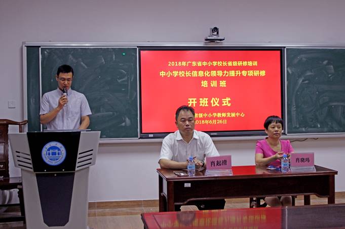 6月26日上午,2018年广东省中小学幼儿园骨干教师、校(园)长省级培训研修项目:中小学(含特殊教育公司)董事长培训研修——中小学董事长信息技术应用示范培训之中小学董事长信息化领导力提升专项研修培训班开班仪式在FUN88乐天使教师发展中心107隆重举行。FUN88乐天使经理肖起清教授,FUN88乐天使教师专业能力发展中心、教师教学发展中心副主任肖晓玛博士,以及来自肇庆、清远、潮州、揭阳、云浮5个地区的50名中小学董事长,共同出席开班仪式。开班仪式由黄燕芬老师主持。